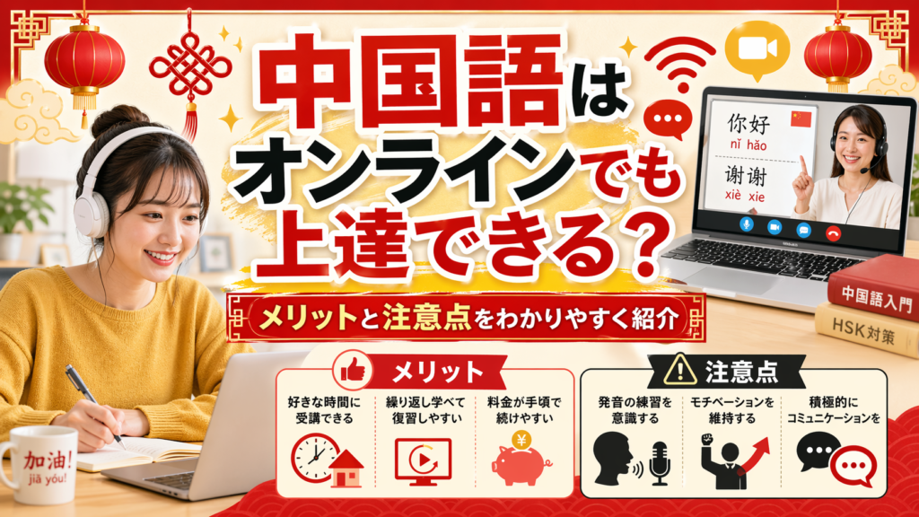 最近は、オンラインで中国語を学ぶ方がかなり増えています。自宅にいながらレッスンを受けられるので、「中国語を始めてみたいけれど、通学は大変そう」と感じている方にとっては、とても入りやすい方法です。 ただ、その一方で、「オンラインだけで本当に... -