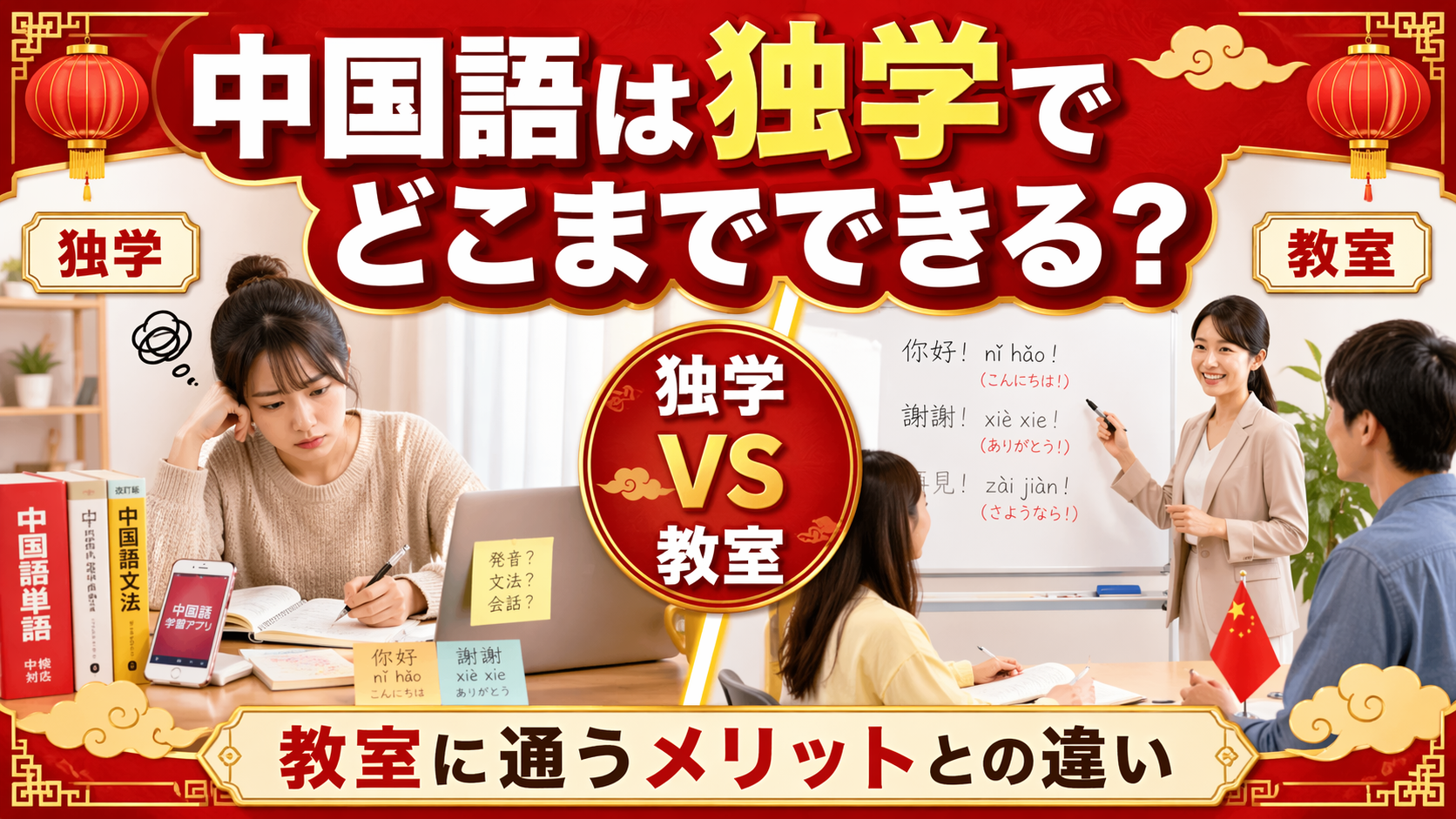 そこでこの記事では、中国語は独学でどこまでできるのか、そして中国語教室に通うメリットとは何がちがうのかを分かりやすく解説します。中国語を独学で始めるか、教室に通うかで迷っている方は、ぜひ参考にしてみてください。