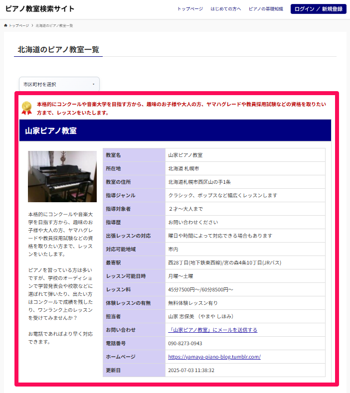 「札幌市なら札幌市ページのトップ」、「横浜市なら横浜市ページのトップ」というように、あなたの教室が、地域の入口に必ず表示される仕組みです。