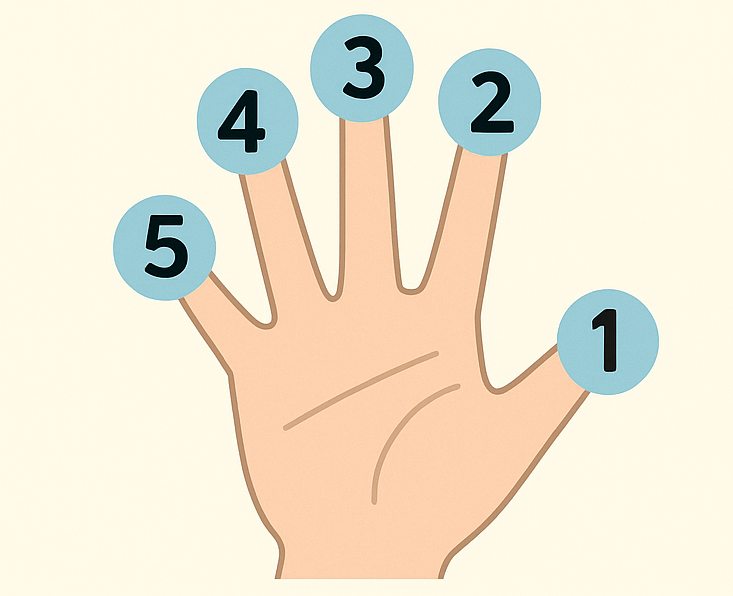 つまり、親ゆびが「1」、こゆびが「5」というふうに、1から5までの数字であらわします。